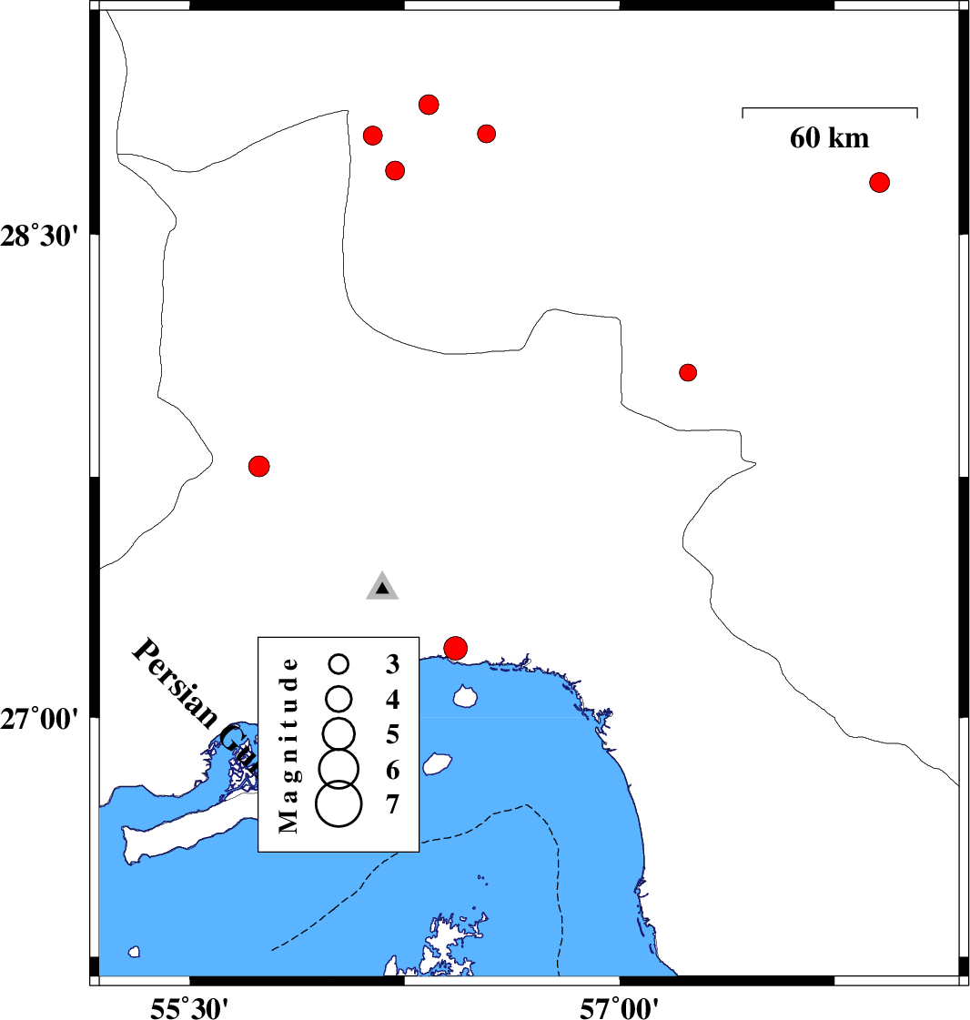 2018/05/08 | 18:27:35.2 | 22:57:35.2 | 28.059 | 57.804 | 15 | ML:4.6 | Kerman Province, 16 km North-East of Kahnuj | ||