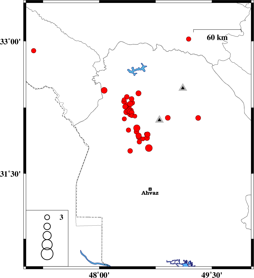 | 2018/05/21 | 05:44:57.1 | 10:14:57.1 | 32.275 | 48.374 | 15 | ML3.4 | Khoozestan Province, 12 km South of Dezful | ||