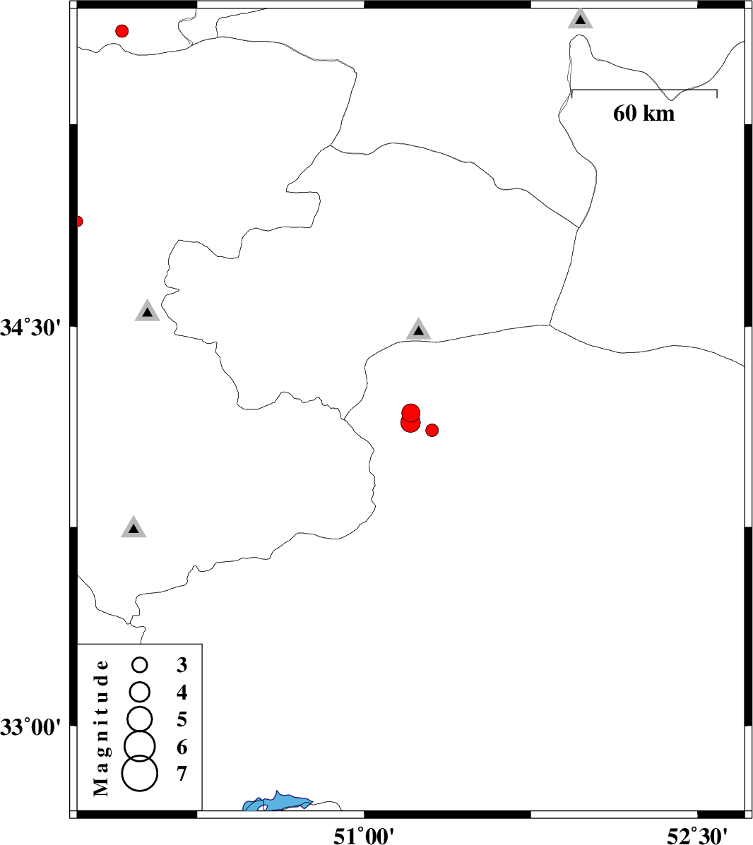 | 2018/05/28 | 16:49:37.1 | 21:19:37.1 | 34.177 | 51.21 | 15 | ML3.6 | Esfahan Province, 27 km North-West of Aran va bidgol | ||