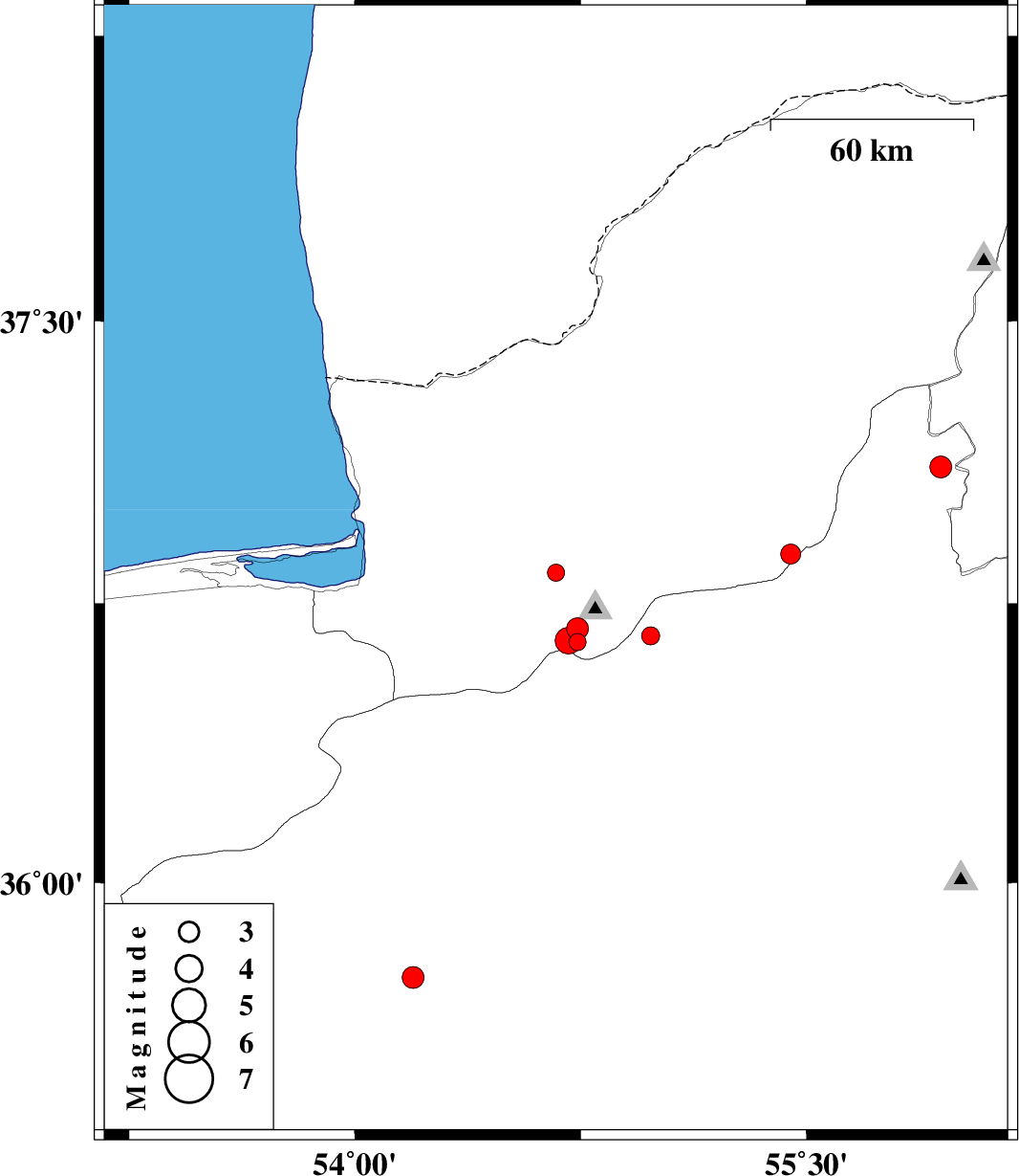 | 2018/05/23 | 00:56:10.2 | 05:26:10.2 | 36.647 | 54.739 | 14 | ML2.6 | Golestan Province, 31 km South-West of Ali Abad | ||