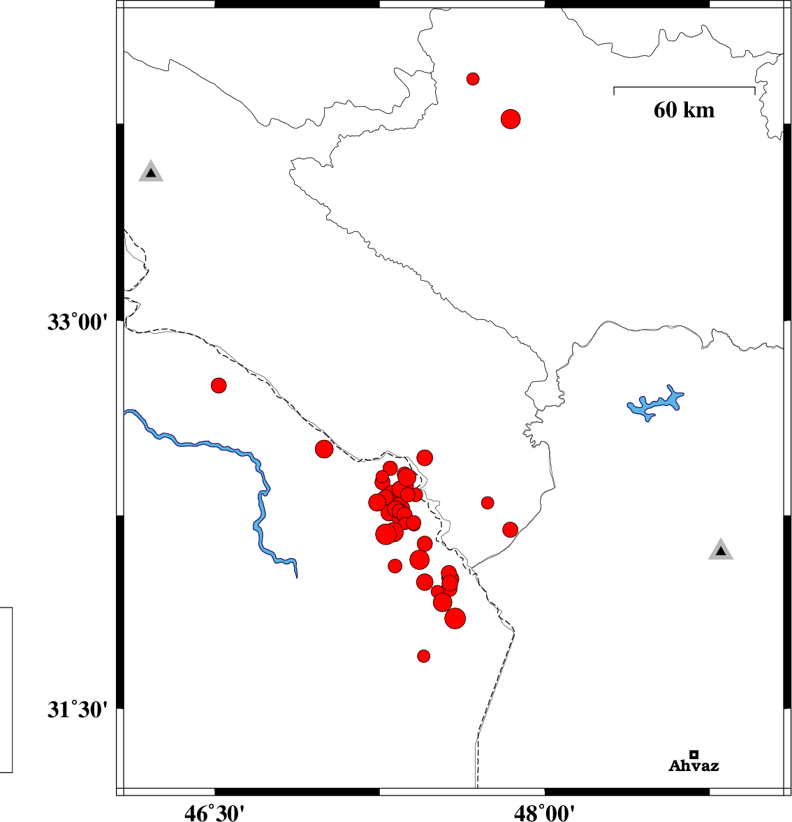 | 2018/05/28 | 01:41:51.4 | 06:11:51.4 | 32.269 | 48.445 | 15 | ML3 | Khoozestan Province, 13 km South of Dezful | ||