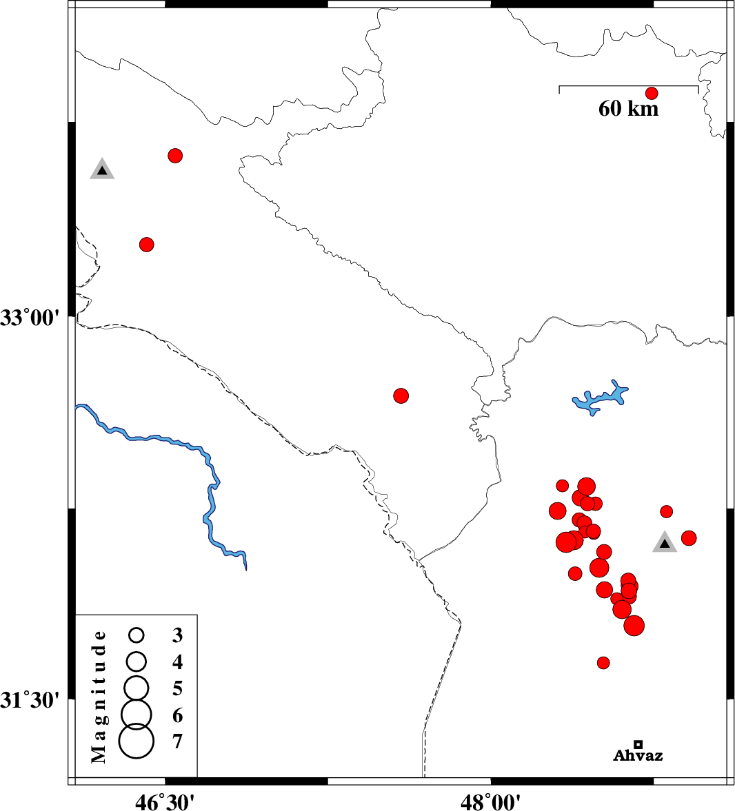 | 2018/05/28 | 01:41:51.4 | 06:11:51.4 | 32.269 | 48.445 | 15 | ML3 | Khoozestan Province, 13 km South of Dezful | ||