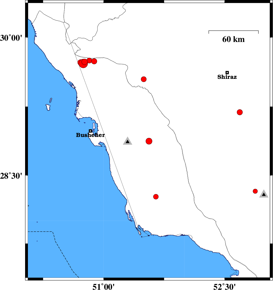 | 2018/03/19 | 06:17:10.8 | 09:47:10.8 | 29.741 | 50.882 | 14 | ML3.1 | Bushehr Province, 40 km North-East of Bandar-e genaveh | ||