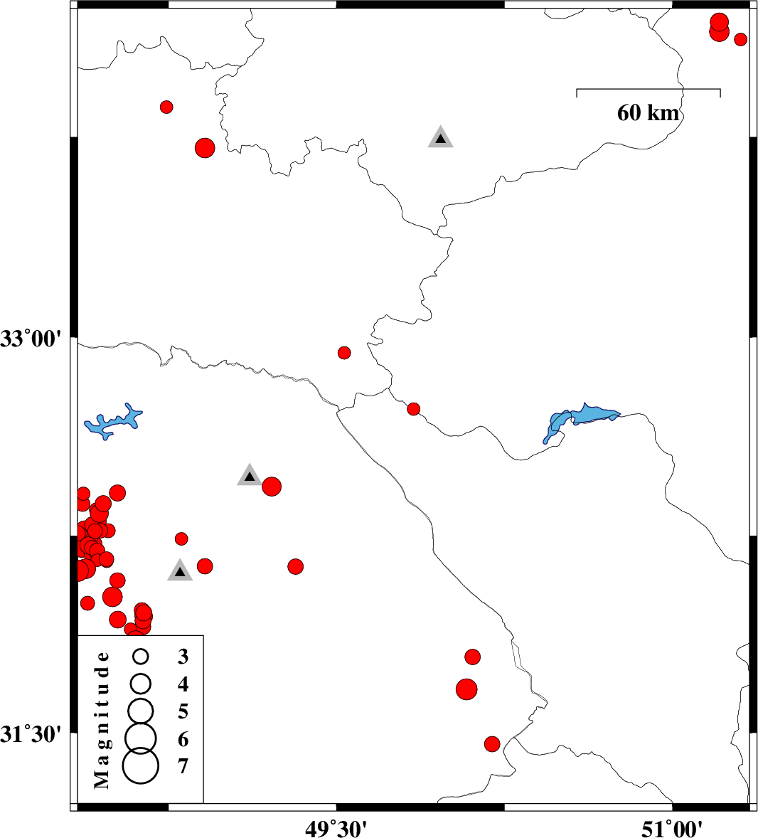 | 2018/06/06 | 02:08:55.6 | 06:38:55.6 | 32.729 | 49.844 | 6 | ML2.6 | Esfahan Province, 34 km South-West of Fereydunshahr | ||