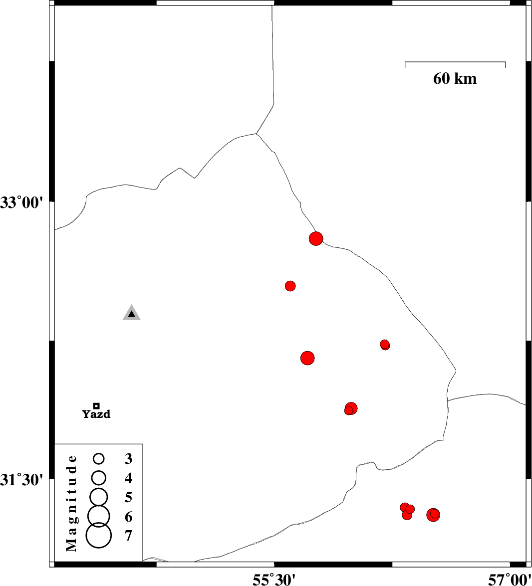 | 2018/05/11 | 02:05:34.4 | 06:35:34.4 | 32.156 | 55.71 | 15 | ML4 | Yazd Province, 68 km North-East of Bafq |