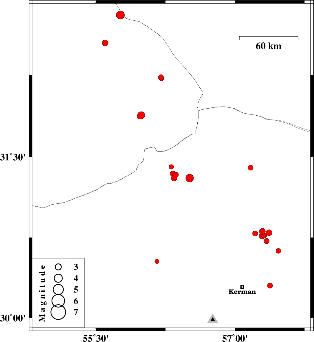 | 2018/06/02 | 13:56:05.4 | 18:26:05.4 | 30.717 | 57.341 | 14 | ML2.6 | Kerman Province, 54 km North-East of Kerman | ||