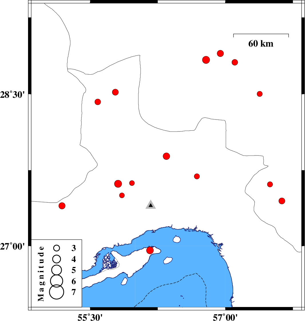 2018/05/28 | 16:18:05.5 | 20:48:05.5 | 27.446 | 57.628 | 18 | ML:3.1 | Kerman Province, 14 km -East of Manujan | ||