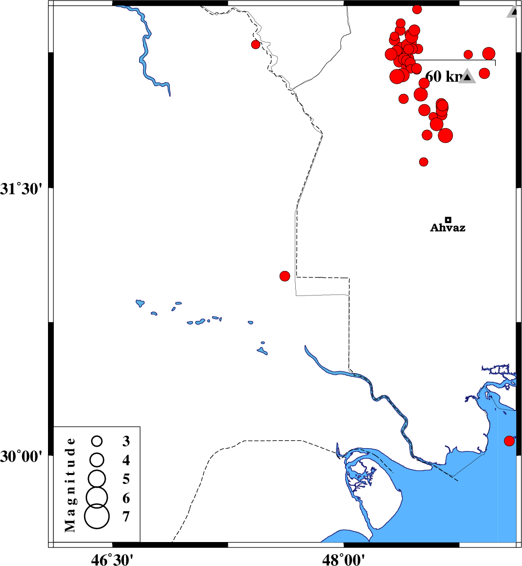 | 2018/05/29 | 04:39:03.1 | 09:09:03.1 | 31.853 | 48.603 | 15 | ML3.8 | Khoozestan Province, 32 km South-West of Shushtar | ||