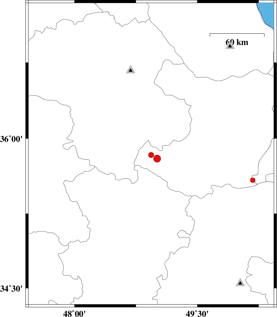 | 2018/06/10 | 06:41:34.9 | 11:11:34.9 | 35.8 | 49.01 | 15 | ML3.9 | Ghazvin Province, 46 km North of Razan |