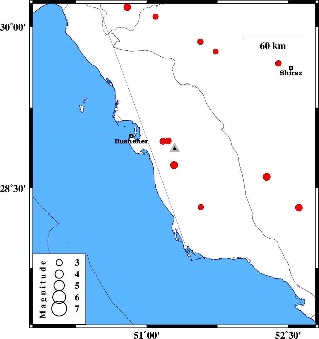 | 2018/05/19 | 13:46:53.5 | 18:16:53.5 | 28.322 | 51.574 | 6 | ML2.7 | Bushehr Province, 42 km South-East of Khormog |