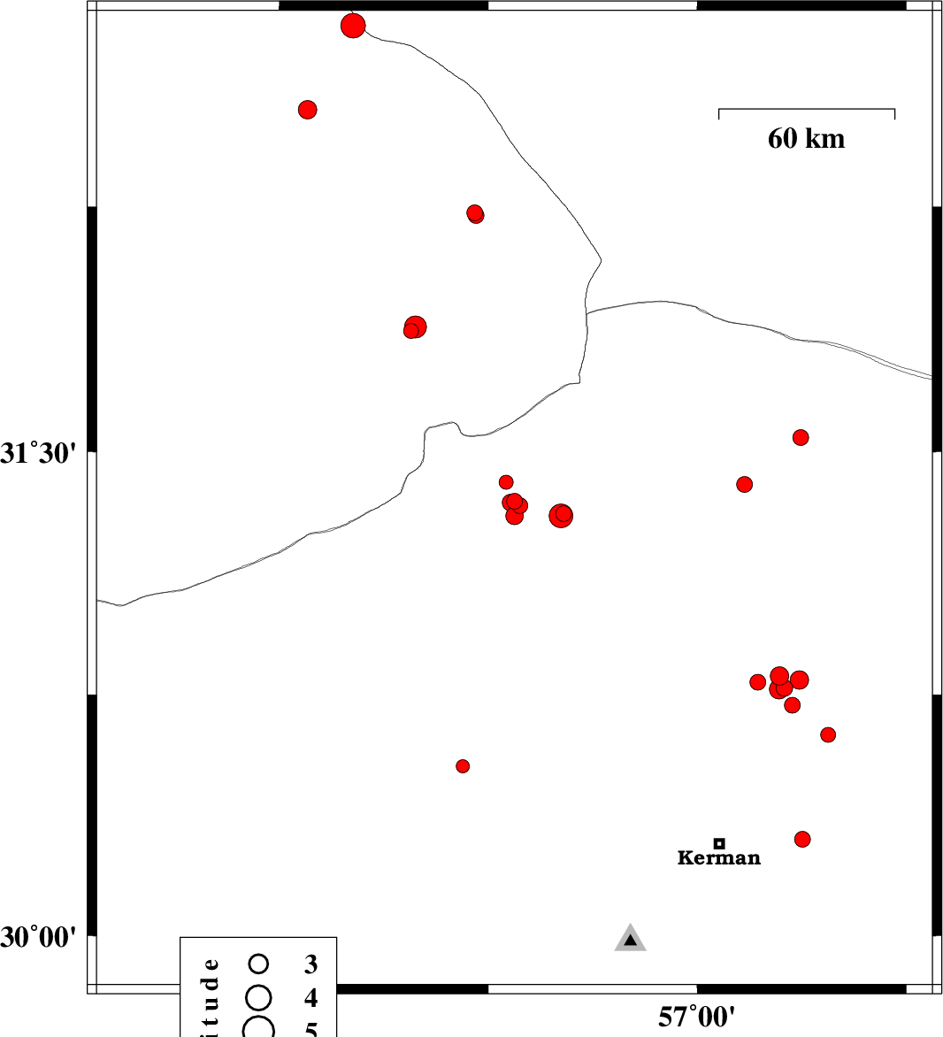 | 2018/06/11 | 09:58:01.1 | 14:28:01.1 | 30.626 | 57.469 | 14 | ML2.4 | Kerman Province, 53 km North-East of Kerman | ||