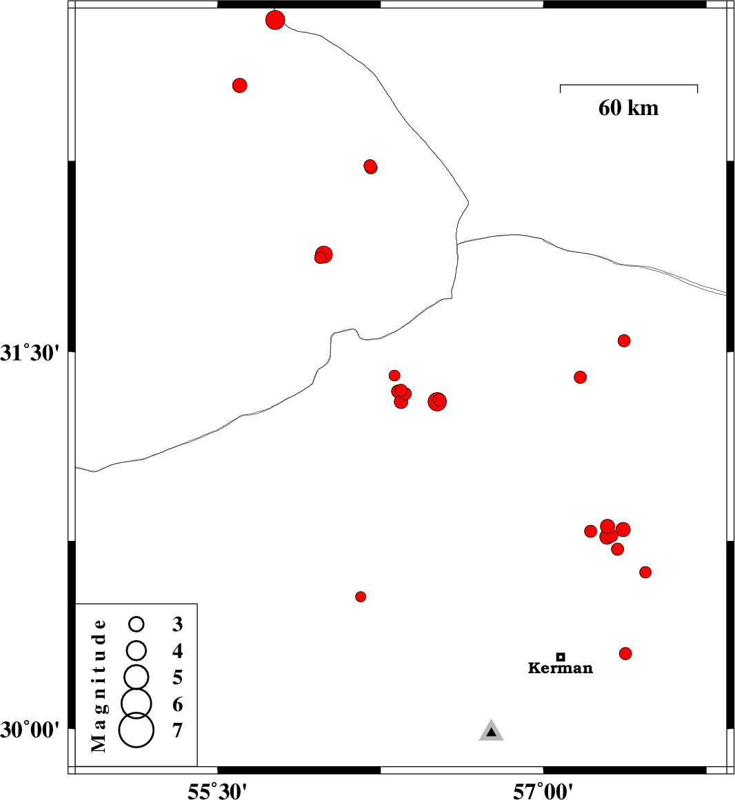 | 2018/05/17 | 10:18:29.6 | 14:48:29.6 | 30.796 | 57.367 | 15 | ML2.9 | Kerman Province, 63 km North-East of Kerman | ||