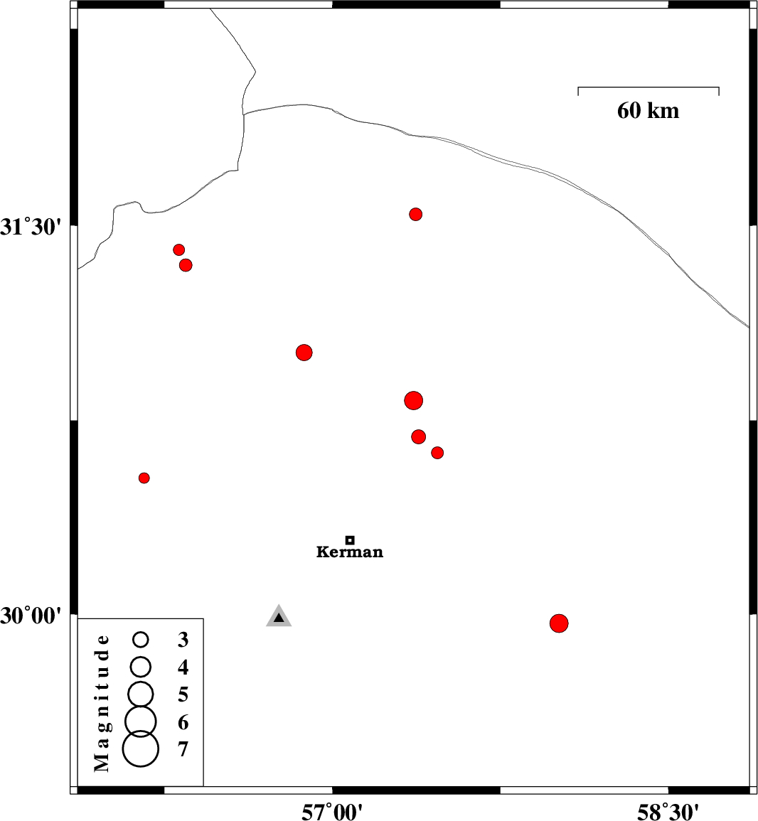 | 2018/06/14 | 13:20:11.6 | 17:50:11.6 | 31.012 | 56.874 | 14 | ML3.3 | Kerman Province, 29 km South of Ravar | ||