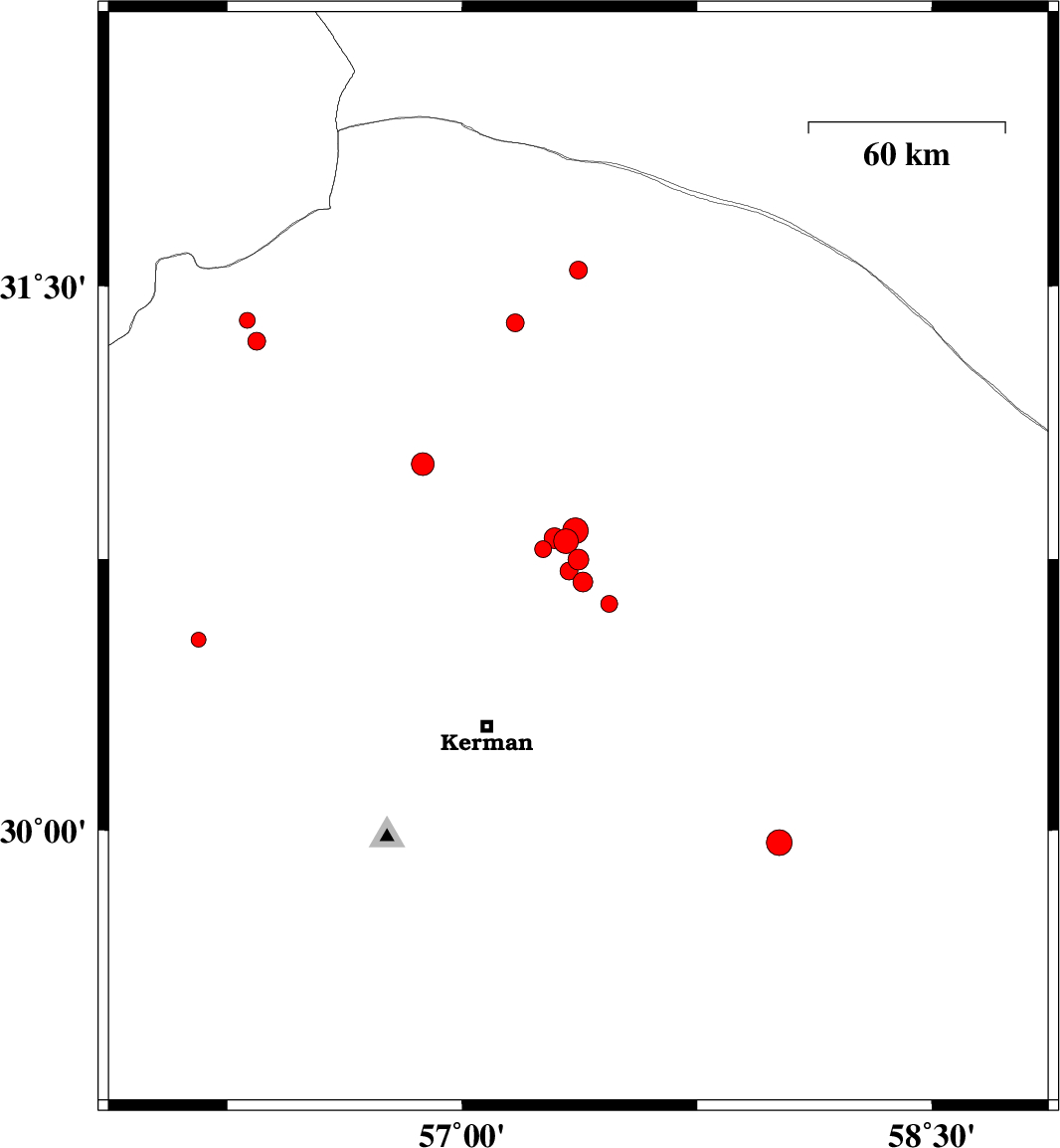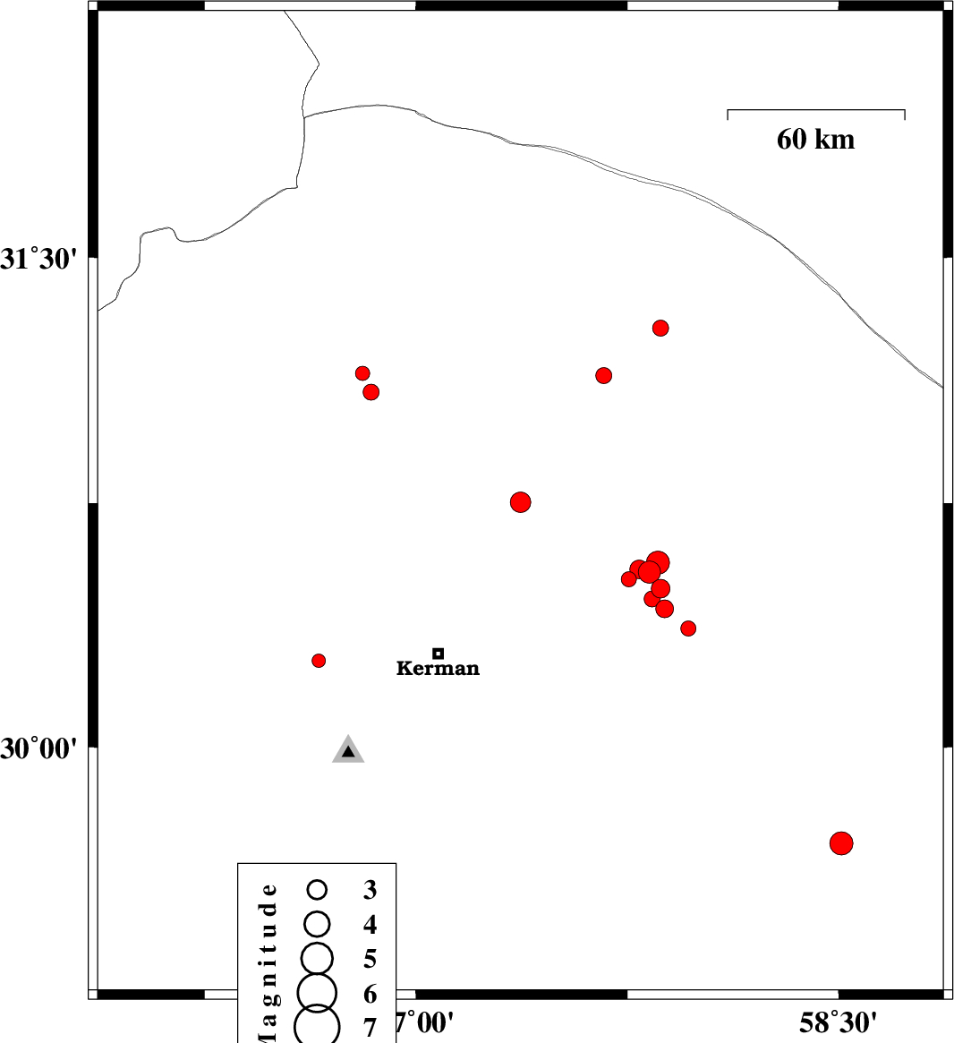 | 2018/06/11 | 09:58:01.1 | 14:28:01.1 | 30.626 | 57.469 | 14 | ML2.4 | Kerman Province, 53 km North-East of Kerman | ||