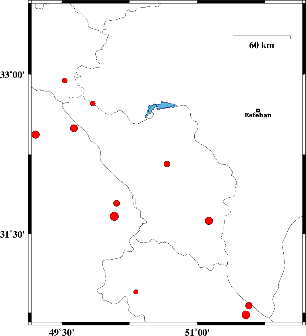 2018/06/06 | 02:08:55.6 | 06:38:55.6 | 32.729 | 49.844 | 6 | ML:2.6 | Esfahan Province, 34 km South-West of Fereydunshahr | ||