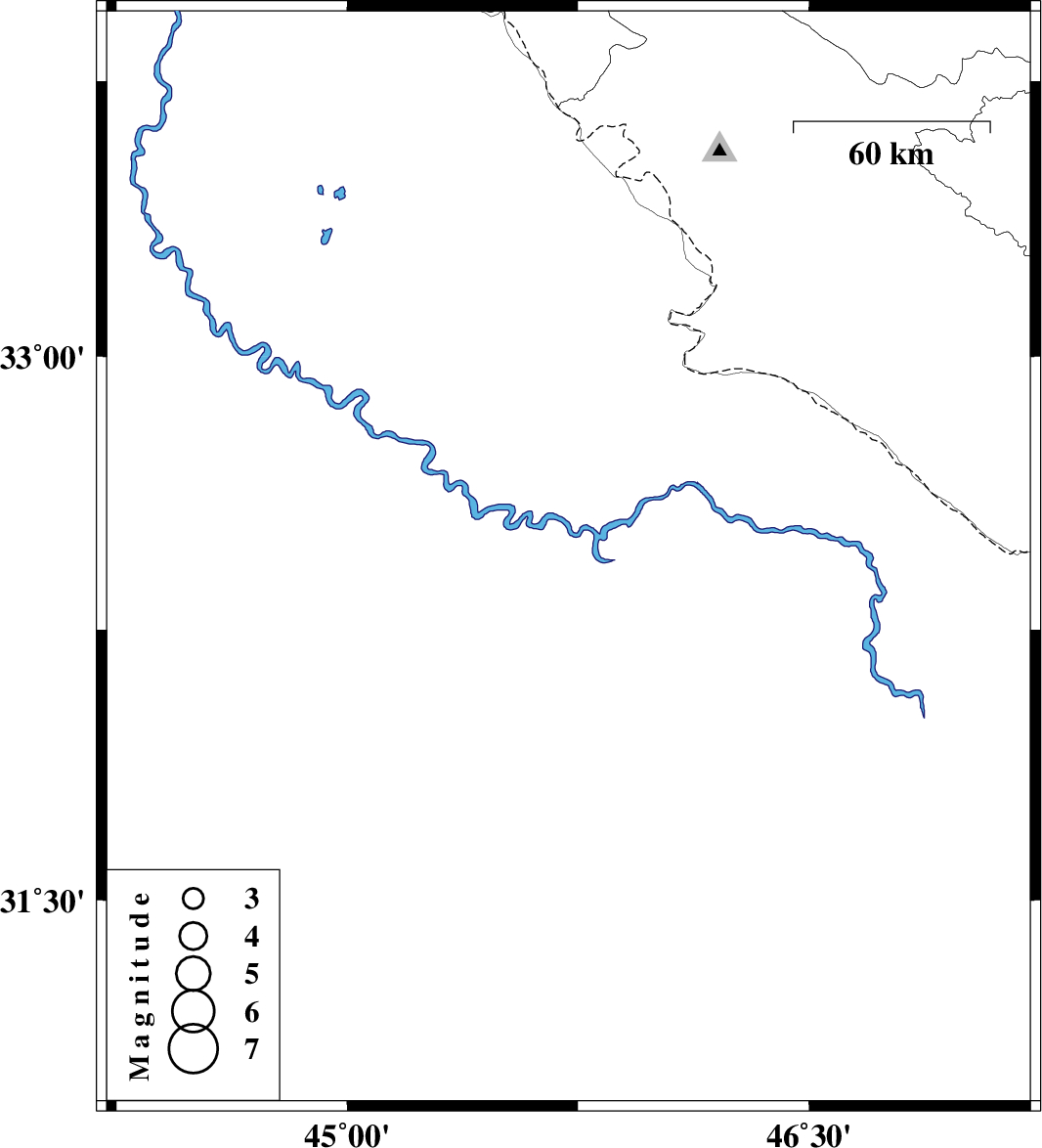 | 2018/06/23 | 00:04:54.4 | 04:34:54.4 | 32.441 | 45.719 | 15 | ML3.7 | Iraq, 86 km South-West of Mehran |