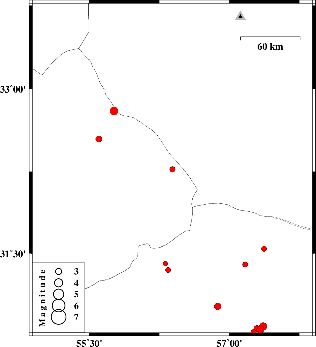 | 2018/06/14 | 13:20:11.6 | 17:50:11.6 | 31.012 | 56.874 | 14 | ML3.3 | Kerman Province, 29 km South of Ravar | ||