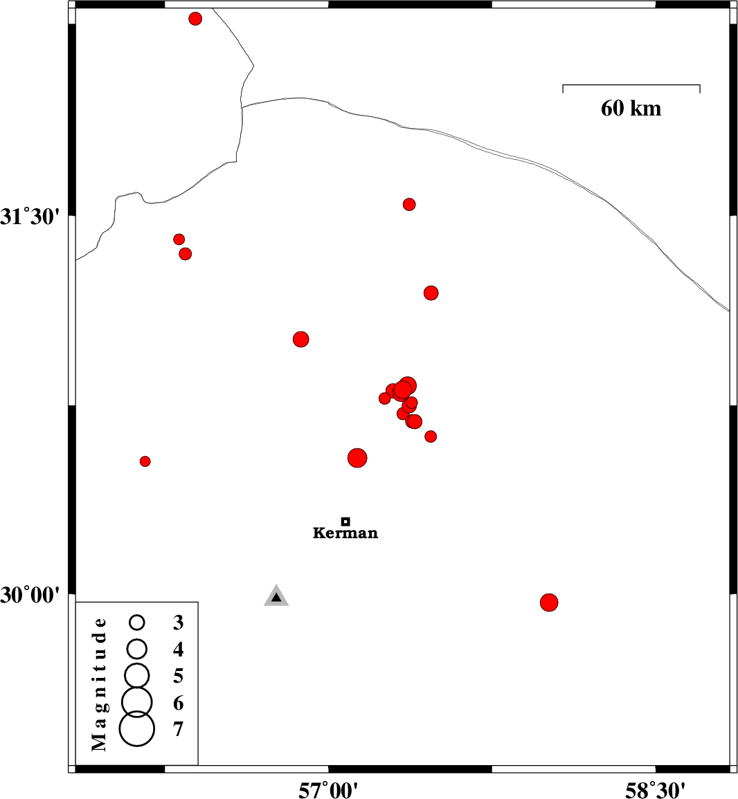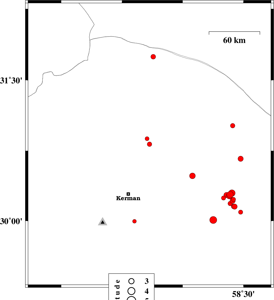 | 2018/06/28 | 19:52:40.4 | 00:22:40.4 | 30.685 | 57.395 | 14 | ML2.9 | Kerman Province, 54 km North-East of Kerman | ||
