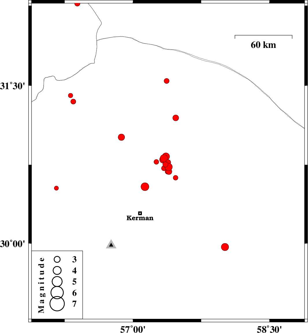 | 2018/06/02 | 13:56:05.4 | 18:26:05.4 | 30.717 | 57.341 | 14 | ML2.6 | Kerman Province, 54 km North-East of Kerman |
