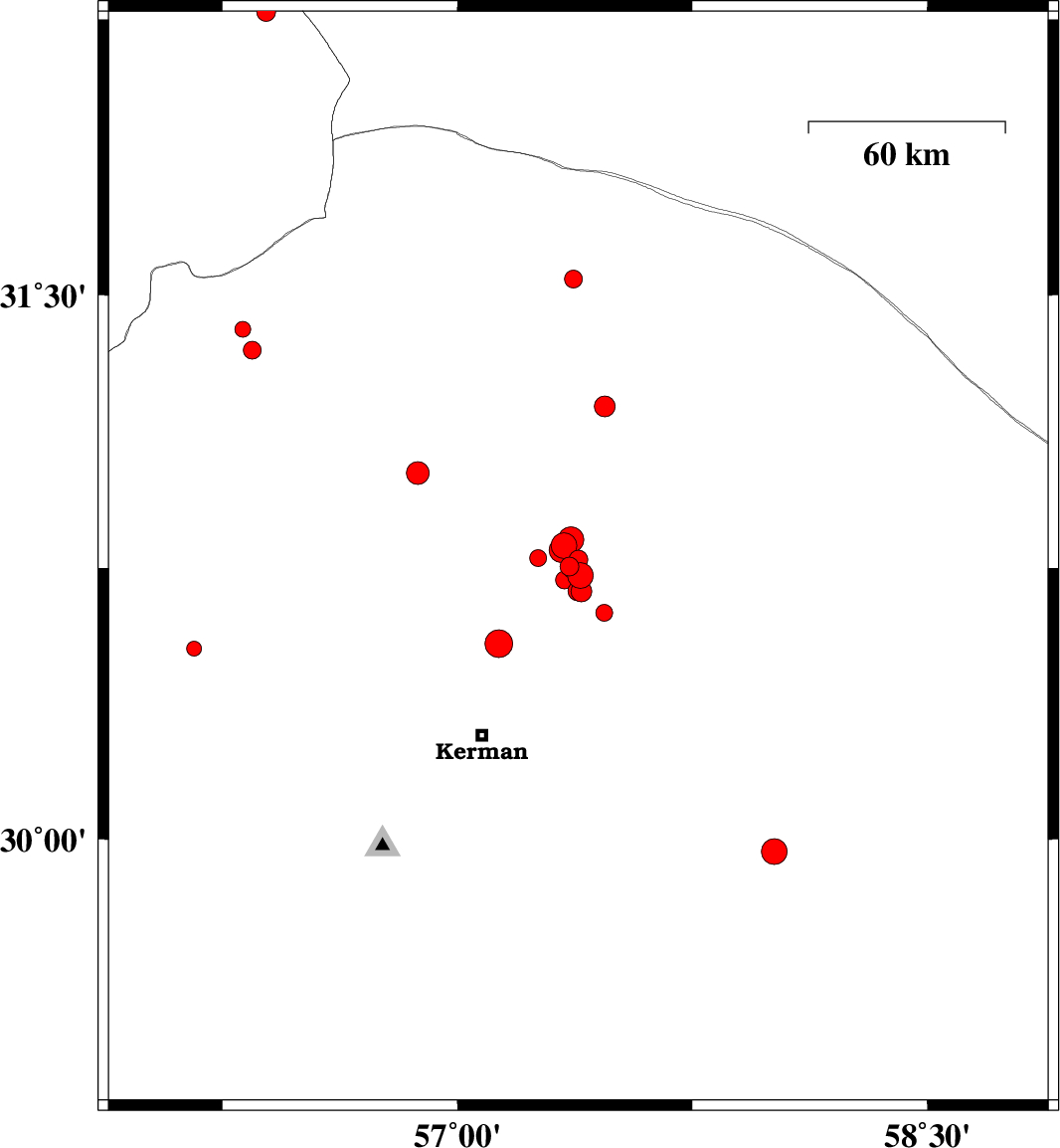 | 2018/06/28 | 19:52:40.4 | 00:22:40.4 | 30.685 | 57.395 | 14 | ML2.9 | Kerman Province, 54 km North-East of Kerman | ||