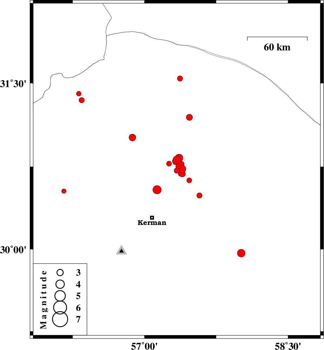 | 2018/06/02 | 13:56:05.4 | 18:26:05.4 | 30.717 | 57.341 | 14 | ML2.6 | Kerman Province, 54 km North-East of Kerman |