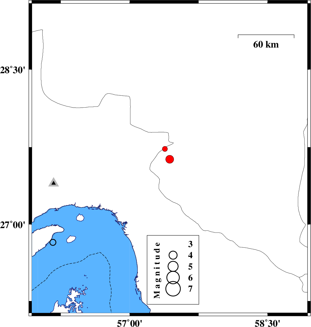 | 2018/06/27 | 23:46:33.9 | 04:16:33.9 | 27.533 | 57.487 | 15 | ML4 | Kerman Province, 14 km North of Manujan |