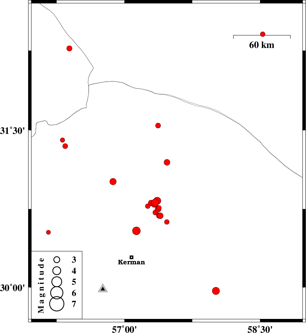 | 2018/06/28 | 19:52:40.4 | 00:22:40.4 | 30.685 | 57.395 | 14 | ML2.9 | Kerman Province, 54 km North-East of Kerman | ||