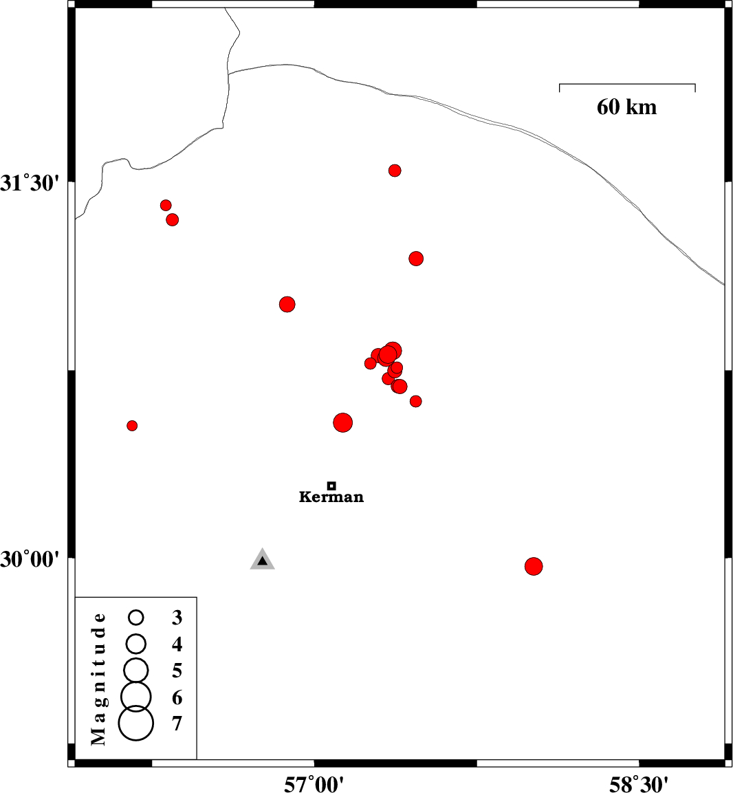 | 2018/06/11 | 09:58:01.1 | 14:28:01.1 | 30.626 | 57.469 | 14 | ML2.4 | Kerman Province, 53 km North-East of Kerman | ||