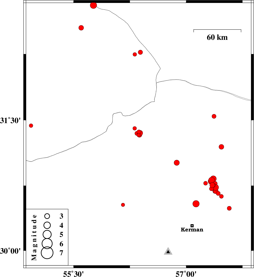 | 2018/06/28 | 19:52:40.4 | 00:22:40.4 | 30.685 | 57.395 | 14 | ML2.9 | Kerman Province, 54 km North-East of Kerman | ||