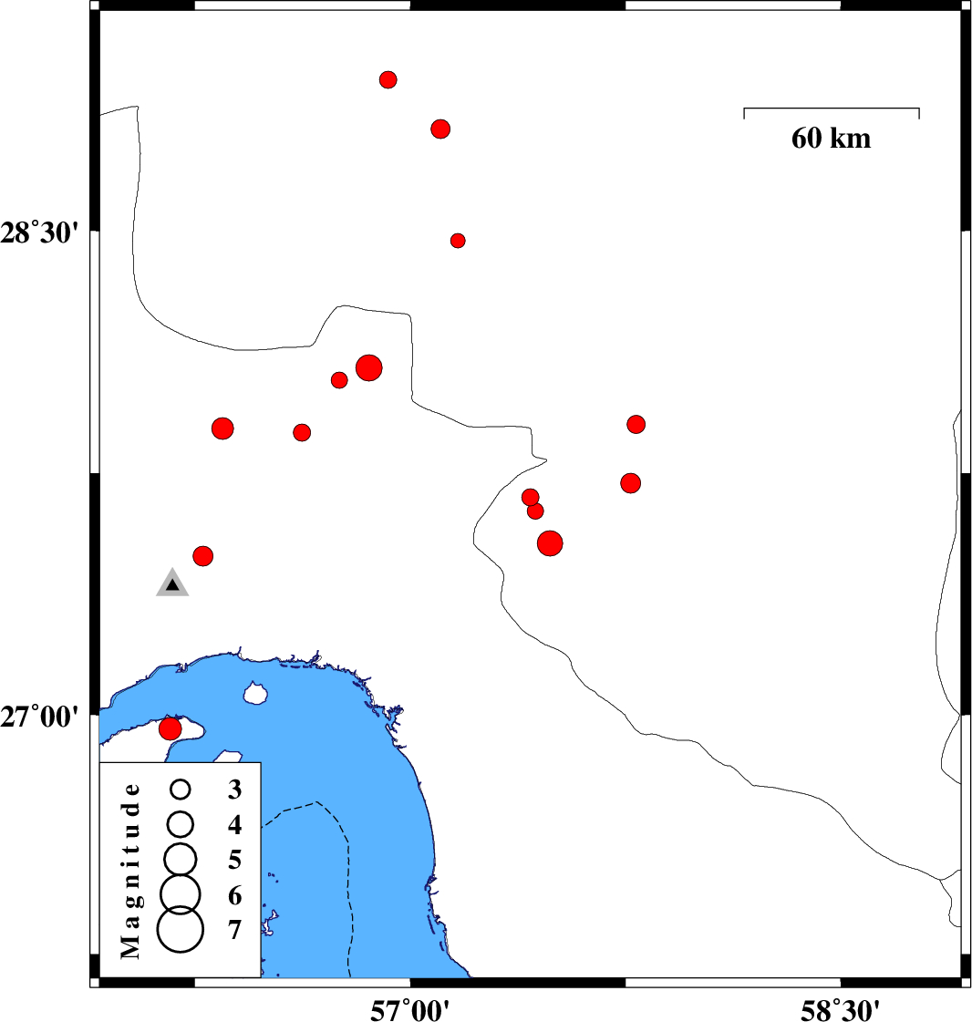 | 2018/06/28 | 01:11:01.3 | 05:41:01.3 | 27.634 | 57.435 | 14 | ML2.6 | Kerman Province, 26 km North of Manujan | ||