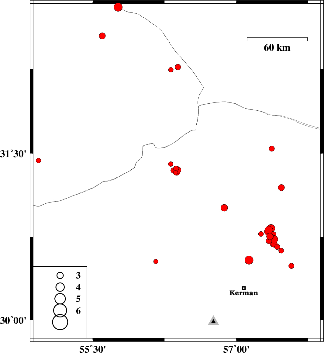 | 2018/06/28 | 19:52:40.4 | 00:22:40.4 | 30.685 | 57.395 | 14 | ML2.9 | Kerman Province, 54 km North-East of Kerman | ||