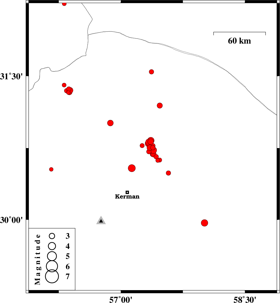 | 2018/06/28 | 19:52:40.4 | 00:22:40.4 | 30.685 | 57.395 | 14 | ML2.9 | Kerman Province, 54 km North-East of Kerman | ||