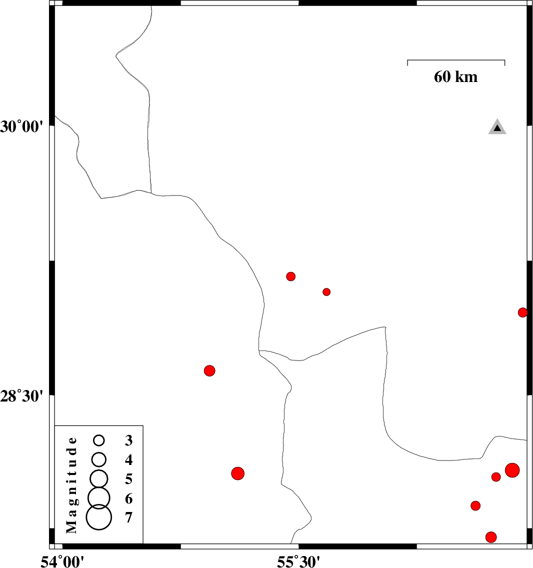 | 2018/07/13 | 09:37:50.5 | 14:07:50.5 | 29.162 | 55.449 | 15 | ML2.6 | Kerman Province, 38 km South-West of Sirjan | ||