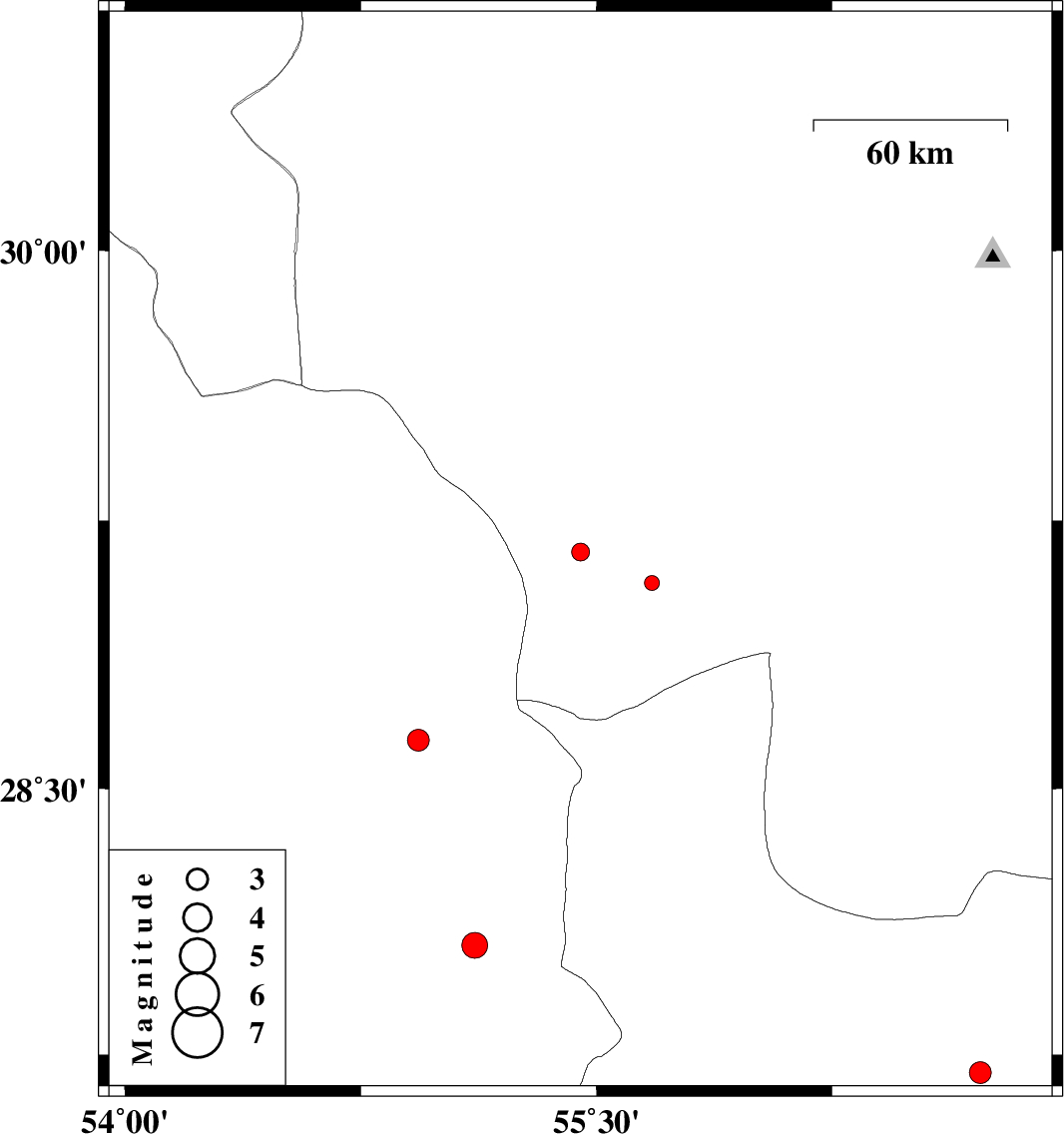 | 2018/07/10 | 20:03:49.4 | 00:33:49.4 | 28.059 | 55.112 | 14 | ML3.7 | Fars Province, 82 km South-West of Hajiabad |