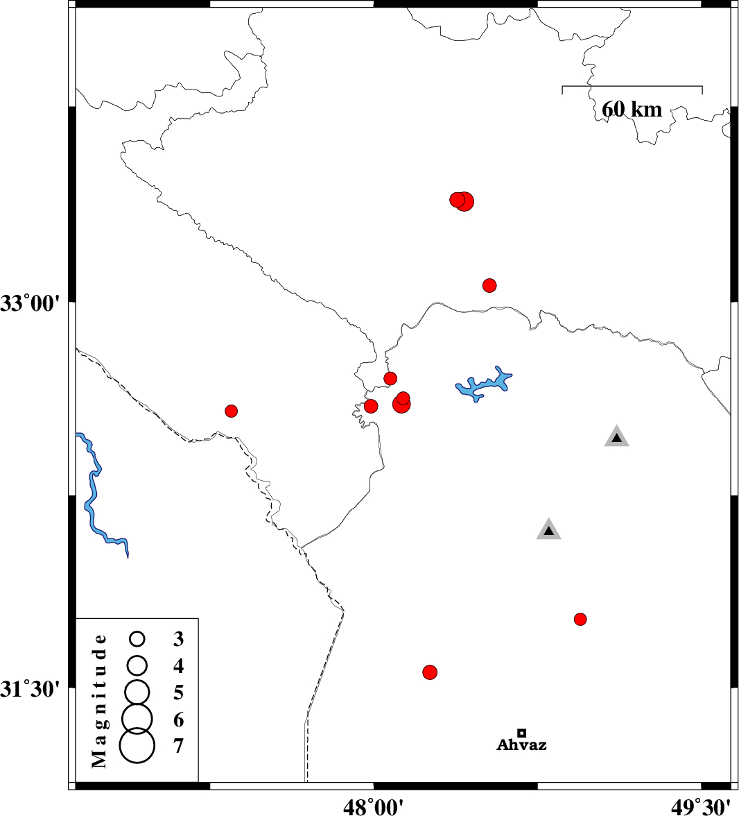 | 2018/07/16 | 02:27:36.0 | 06:57:36.0 | 31.768 | 48.946 | 15 | ML2.5 | Khoozestan Province, 32 km South of Shushtar | ||