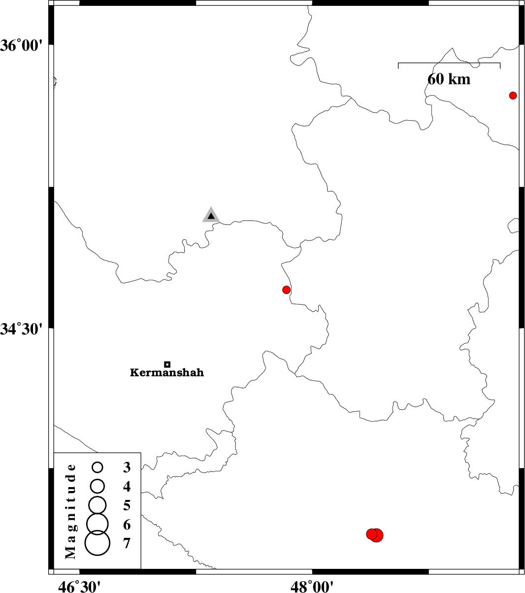 | 2018/07/16 | 01:45:36.2 | 06:15:36.2 | 34.704 | 47.833 | 14 | ML2.3 | Kermanshah Province, 25 km North-West of Kangavar | ||