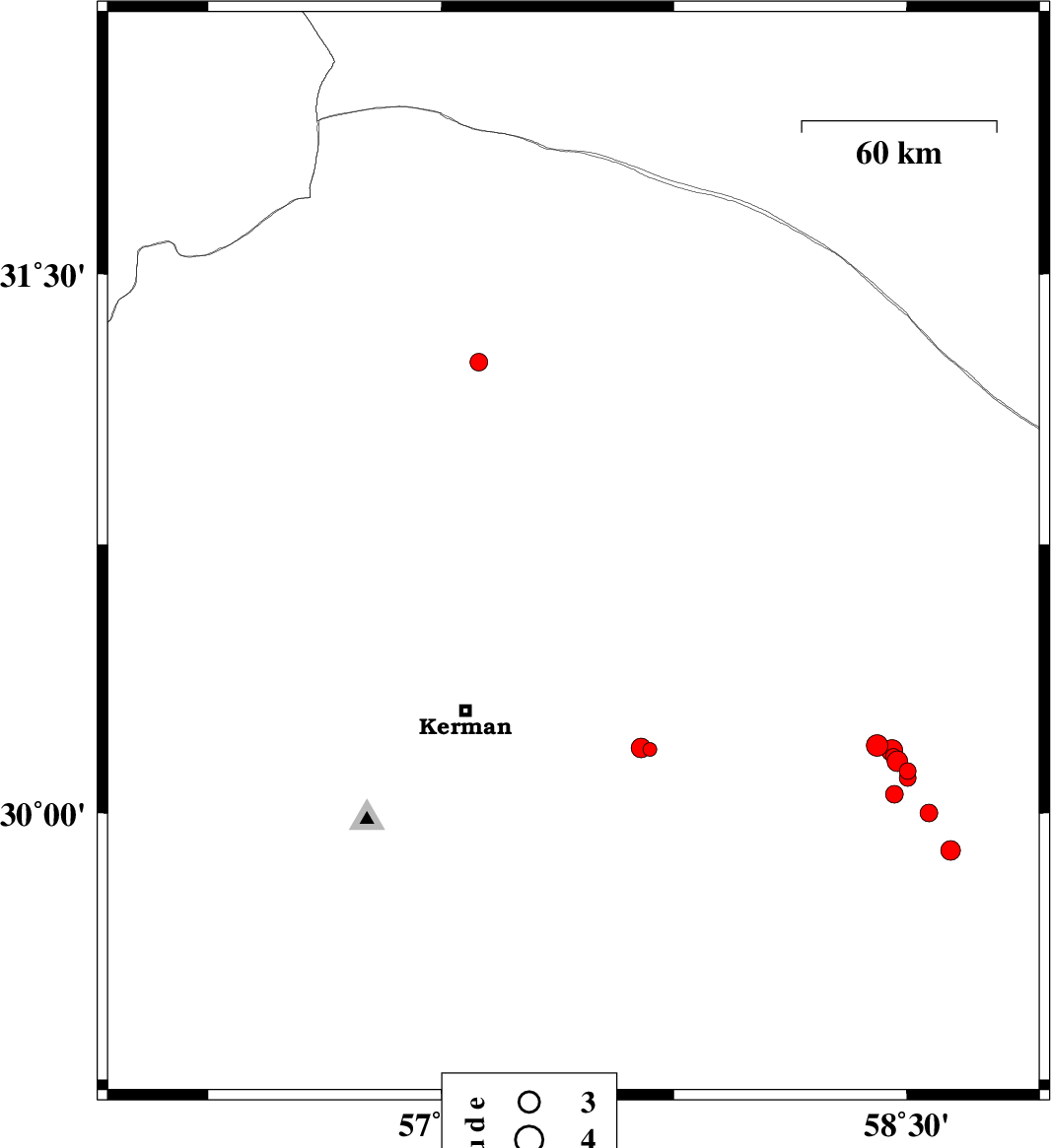 | 2018/07/10 | 09:21:01.9 | 13:51:01.9 | 30.78 | 57.375 | 15 | ML3.1 | Kerman Province, 62 km North-East of Kerman |