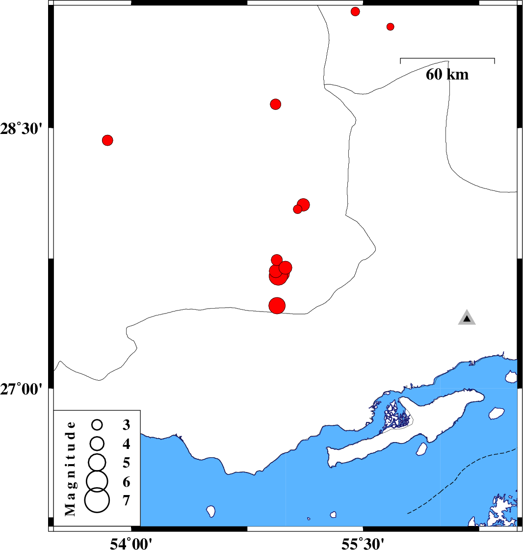 | 2018/07/22 | 05:07:04.5 | 09:37:04.5 | 27.649 | 54.95 | 16 | ML5.3 | Fars Province, 60 km -East of Lar | ||