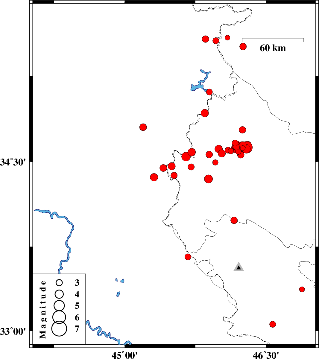 | 2018/06/23 | 21:37:49.5 | 02:07:49.5 | 34.348 | 45.89 | 15 | ML4 | Kermanshah Province, 13 km South of Sar-e pol-e zahab |