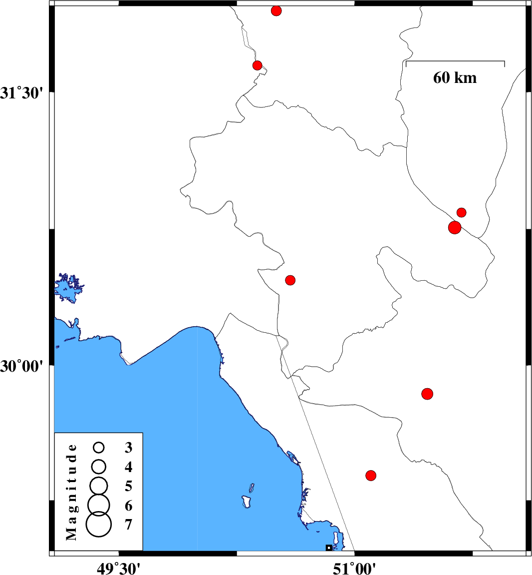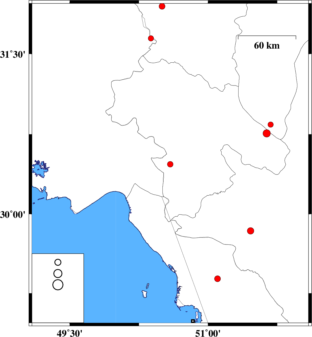 | 2018/06/28 | 22:16:16.1 | 02:46:16.1 | 29.387 | 51.103 | 14 | ML2.9 | Bushehr Province, 17 km North-West of Borazjan |