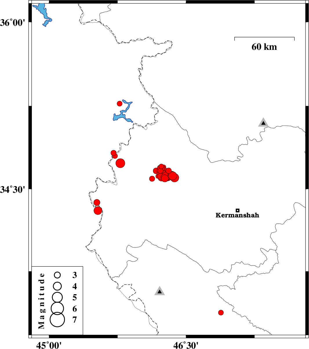 | 2018/07/22 | 10:07:25.9 | 14:37:25.9 | 34.625 | 46.293 | 6 | ML5.6 | Kermanshah Province, 27 km South-West of Javanrud | ||