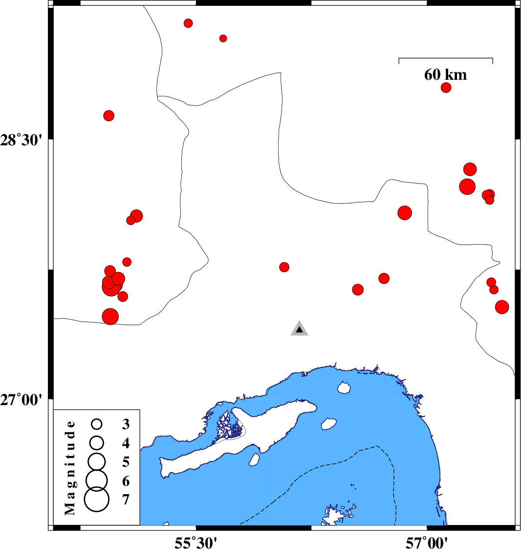 2018/07/04 | 00:57:45.5 | 05:27:45.5 | 28.077 | 56.856 | 17 | ML:4.1 | Hormozgan Province, 83 km North-West of Kahnuj | ||