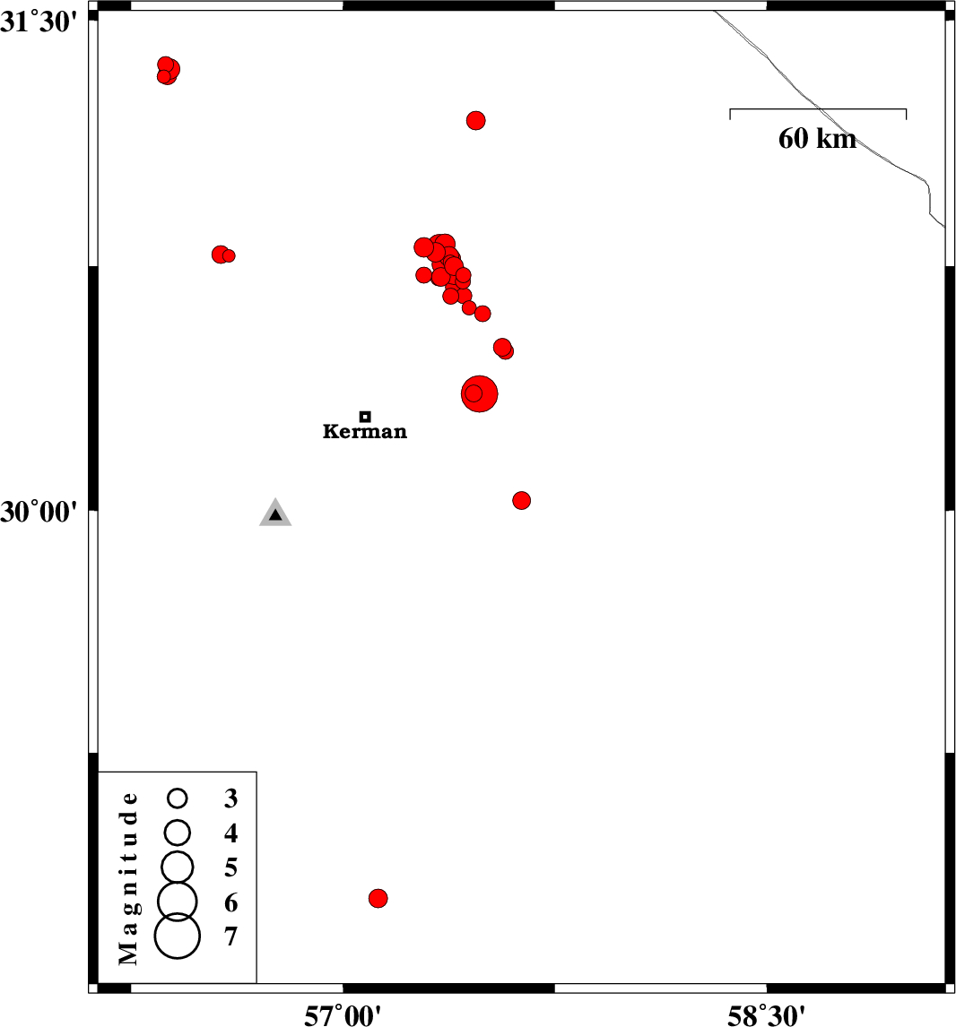 | 2018/06/28 | 19:52:40.4 | 00:22:40.4 | 30.685 | 57.395 | 14 | ML2.9 | Kerman Province, 54 km North-East of Kerman | ||