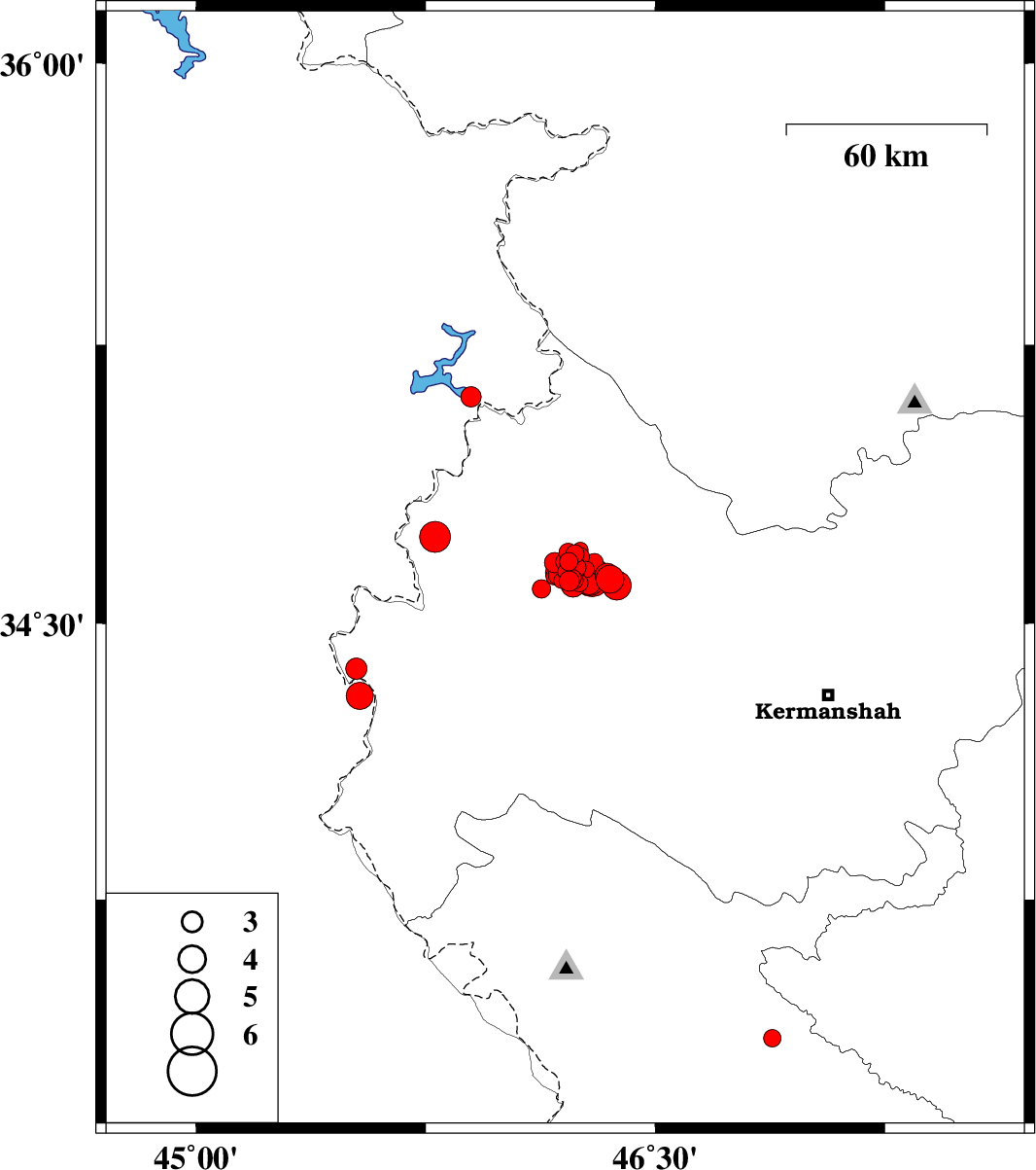 | 2018/07/22 | 10:07:25.9 | 14:37:25.9 | 34.625 | 46.293 | 6 | ML5.6 | Kermanshah Province, 27 km South-West of Javanrud | ||