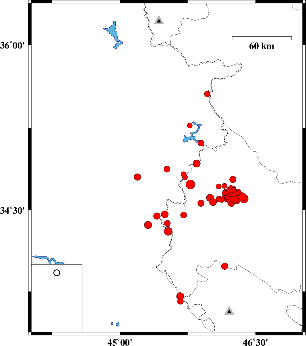 | 2018/06/30 | 06:08:07.6 | 10:38:07.6 | 34.611 | 45.997 | 15 | ML3.7 | Kermanshah Province, 19 km North-East of Sar-e pol-e zahab |