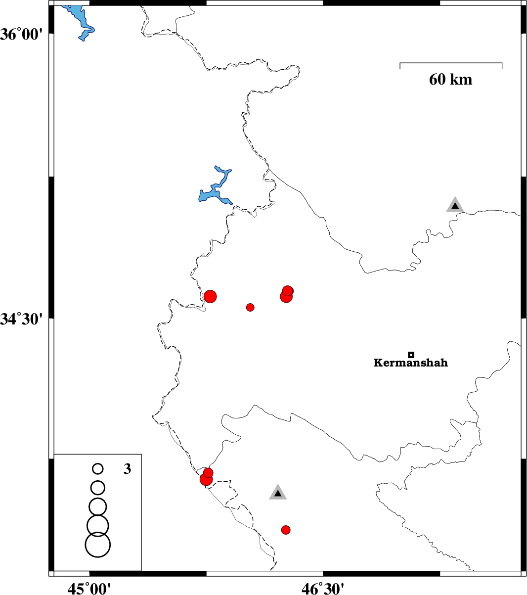 | 2018/08/12 | 16:56:26.4 | 21:26:26.4 | 34.558 | 46.031 | 14 | ML2.3 | Kermanshah Province, 17 km -East of Sar-e pol-e zahab | ||