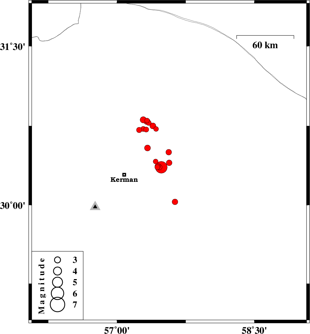 | 2018/07/22 | 20:39:15.6 | 01:09:15.6 | 30.358 | 57.483 | 14 | ML5.8 | Kerman Province, 40 km -East of Kerman | ||