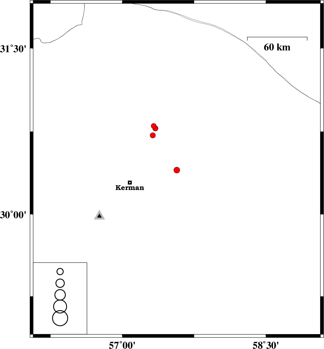 | 2018/08/08 | 18:02:53.3 | 22:32:53.3 | 30.716 | 57.319 | 14 | ML2.6 | Kerman Province, 53 km North-East of Kerman |