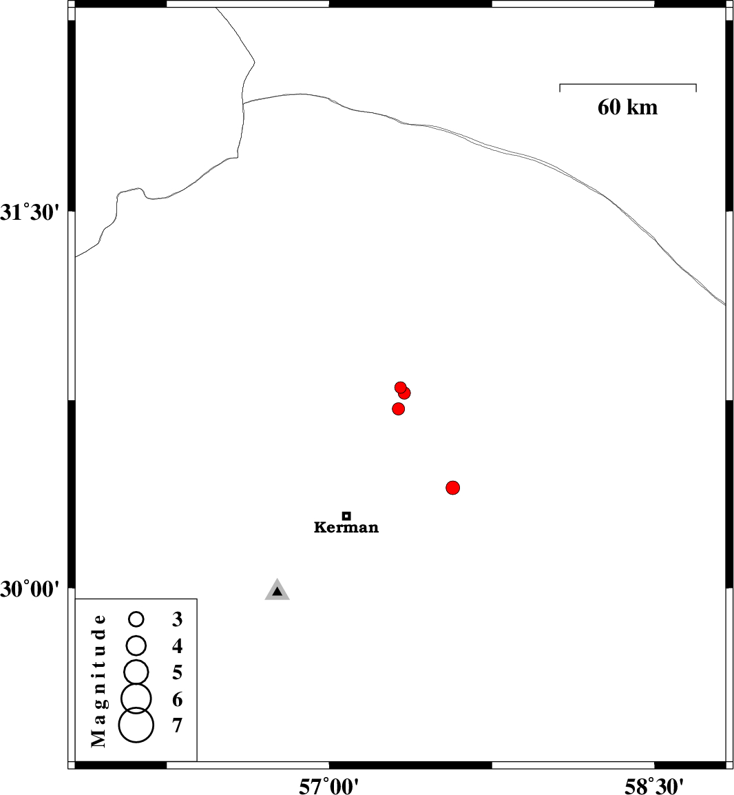 | 2018/08/08 | 18:02:53.3 | 22:32:53.3 | 30.716 | 57.319 | 14 | ML2.6 | Kerman Province, 53 km North-East of Kerman |