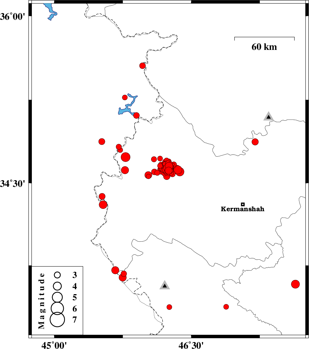 | 2018/07/22 | 10:07:25.9 | 14:37:25.9 | 34.625 | 46.293 | 6 | ML5.6 | Kermanshah Province, 27 km South-West of Javanrud | ||